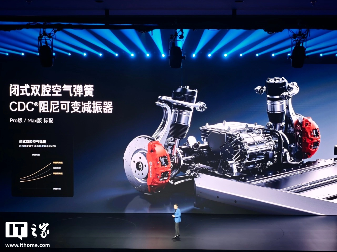 IT之家注意到,小米新一代 SU7 还搭载小米蛟龙底盘,全系升级 Ultra 制动踏板调校风格、全系标配固定卡钳、全系配备前双叉臂后五连杆独立悬架系统、全系标配 265mm 后宽胎,Pro / Max 版可选闭式双腔空气弹簧、CDC 阻尼可变减振器。