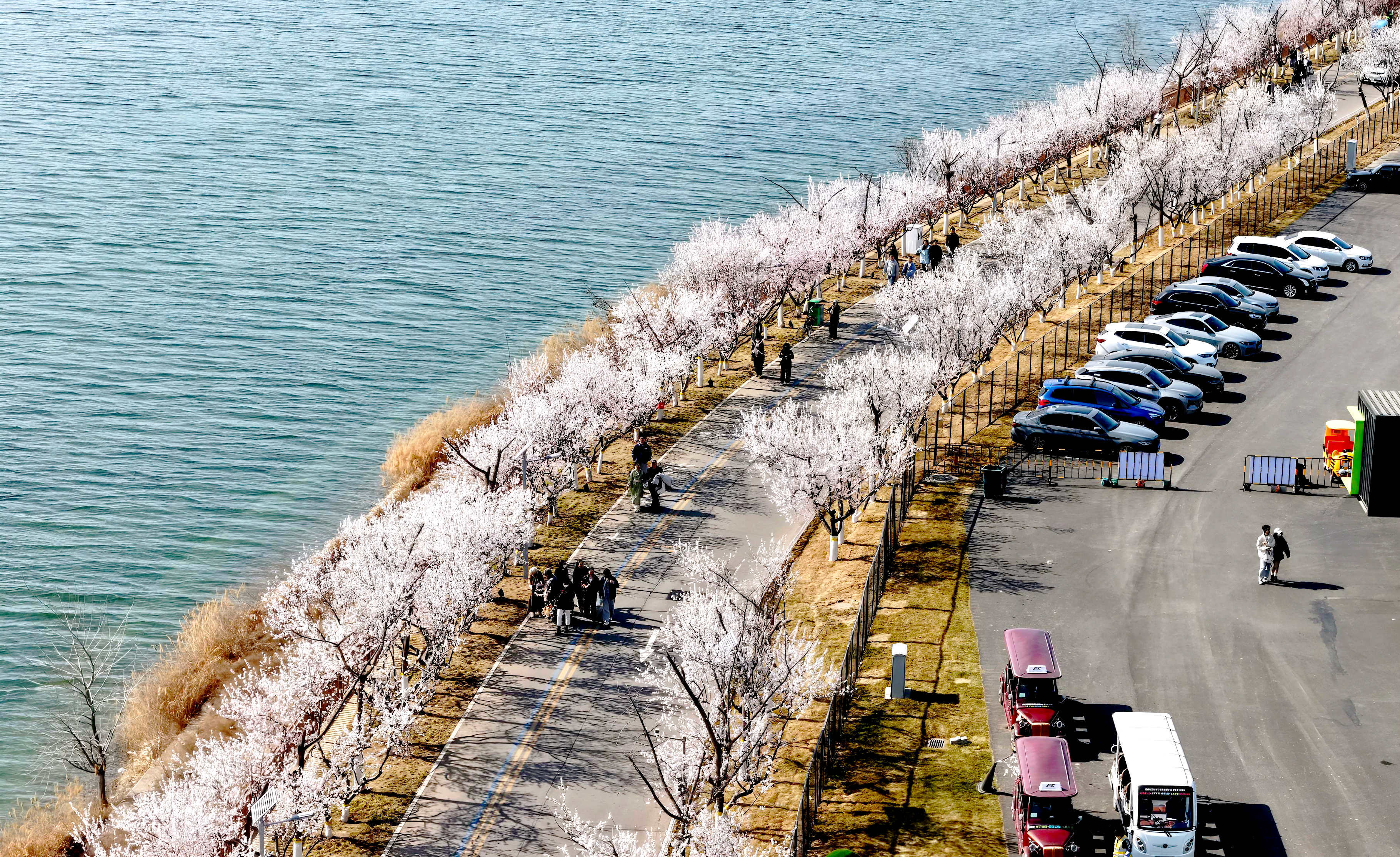 3月16日,游客在河北省石家庄市滹沱河畔赏花游玩(无人机照片)。
